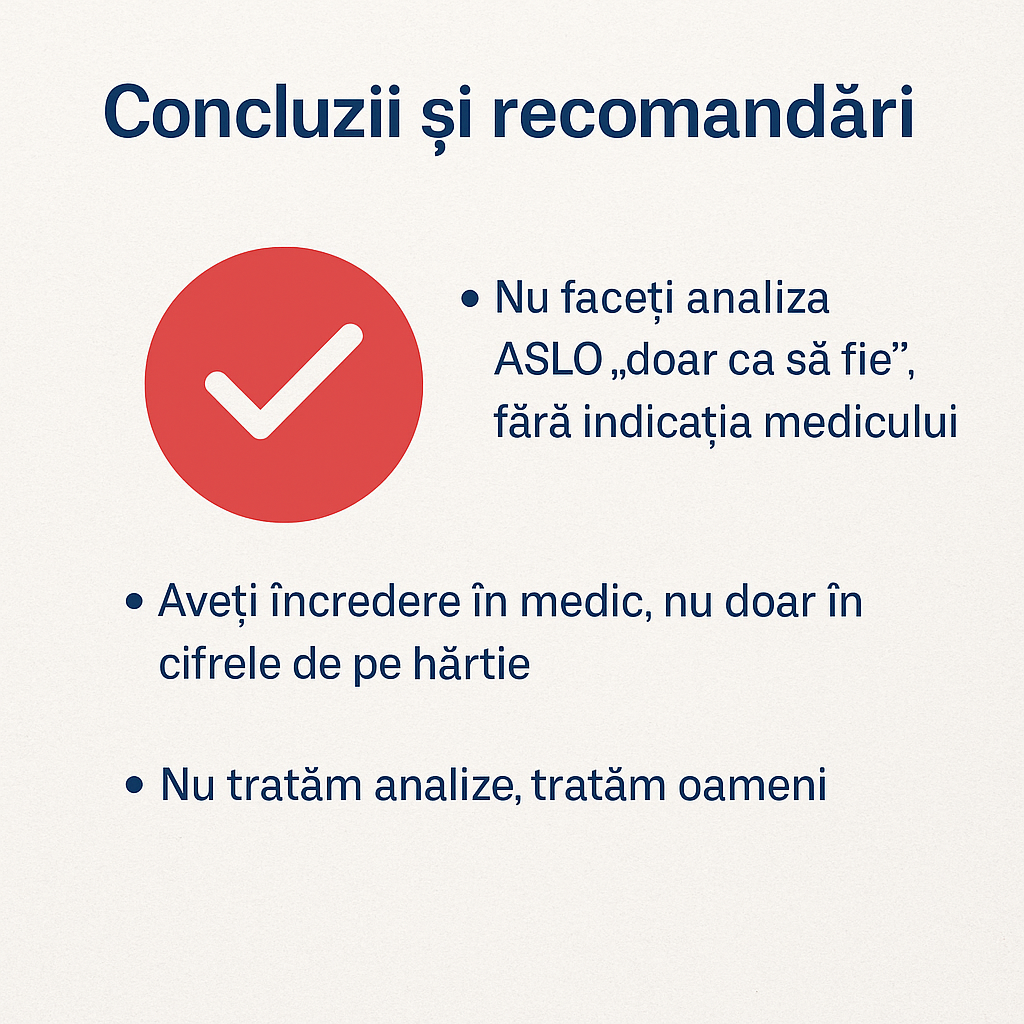 • Aveți încredere în medic, nu doar în cifrele de pe hârtie. Chiar și cu un ASLO de 500–600, nu este obligatoriu un tratament, dacă nu există simptome.